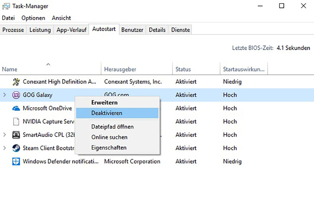 Einige Programme werden automatisch zusammen mit Windows gestartet, obwohl Sie diese vielleicht gar nicht benötigen. Um das zu prüfen, gehen Sie wie folgt vor: Mit der Tastenkombination STRG+ALT+ENTF rufen Sie den Taskmanager auf. Klicken Sie unten auf „mehr Details“, damit Sie das komplette Menü sehen. Unter dem Menüpunkt „Autostart“ sehen Sie eine Liste mit Programmen, die schon während des Boot-Vorgangs gestartet werden. Per Rechtsklick auf einem Programm-Eintrag können Sie die entsprechende Autostart-Option deaktivieren. Das Programm können Sie bei Bedarf dann manuell starten. Schauen Sie sich aber genau an, wofür die jeweiligen Programme da sind, damit Sie nicht versehentlich etwas abschalten, das sie gerne jederzeit nutzen möchten.
