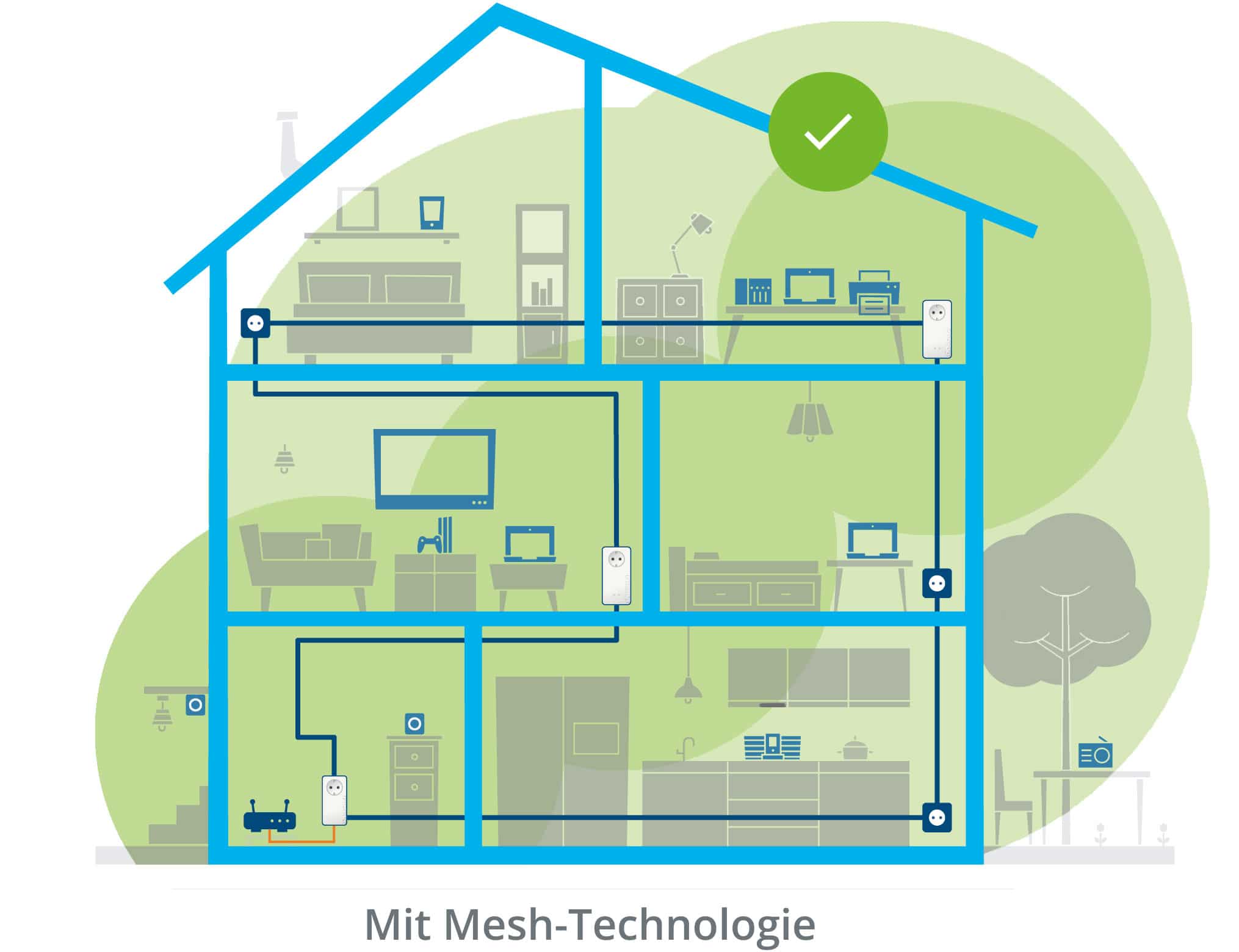 Mehrere WLAN-Zugangspunkte (z. B. Powerline-WiFi-Adapter & Repeater) bilden ein großes, gemeinsames Mesh-Netz, das Nutzer immer automatisch mit dem stärksten WLAN-Signal versorgt. Im Verbund mit effizienten Mesh-Funktionen ergibt sich ein intelligentes Mesh-WiFi-Heimnetz.